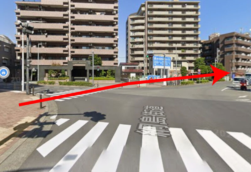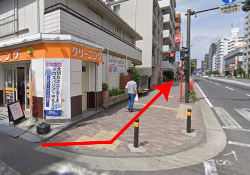 03. 大通りに出ましたら左折して歩道をまっすぐ進みます。